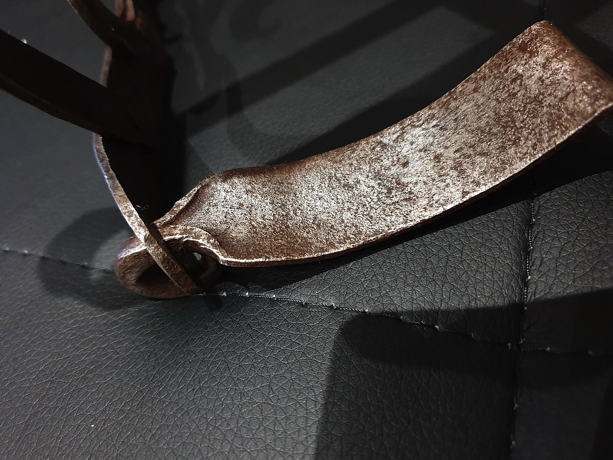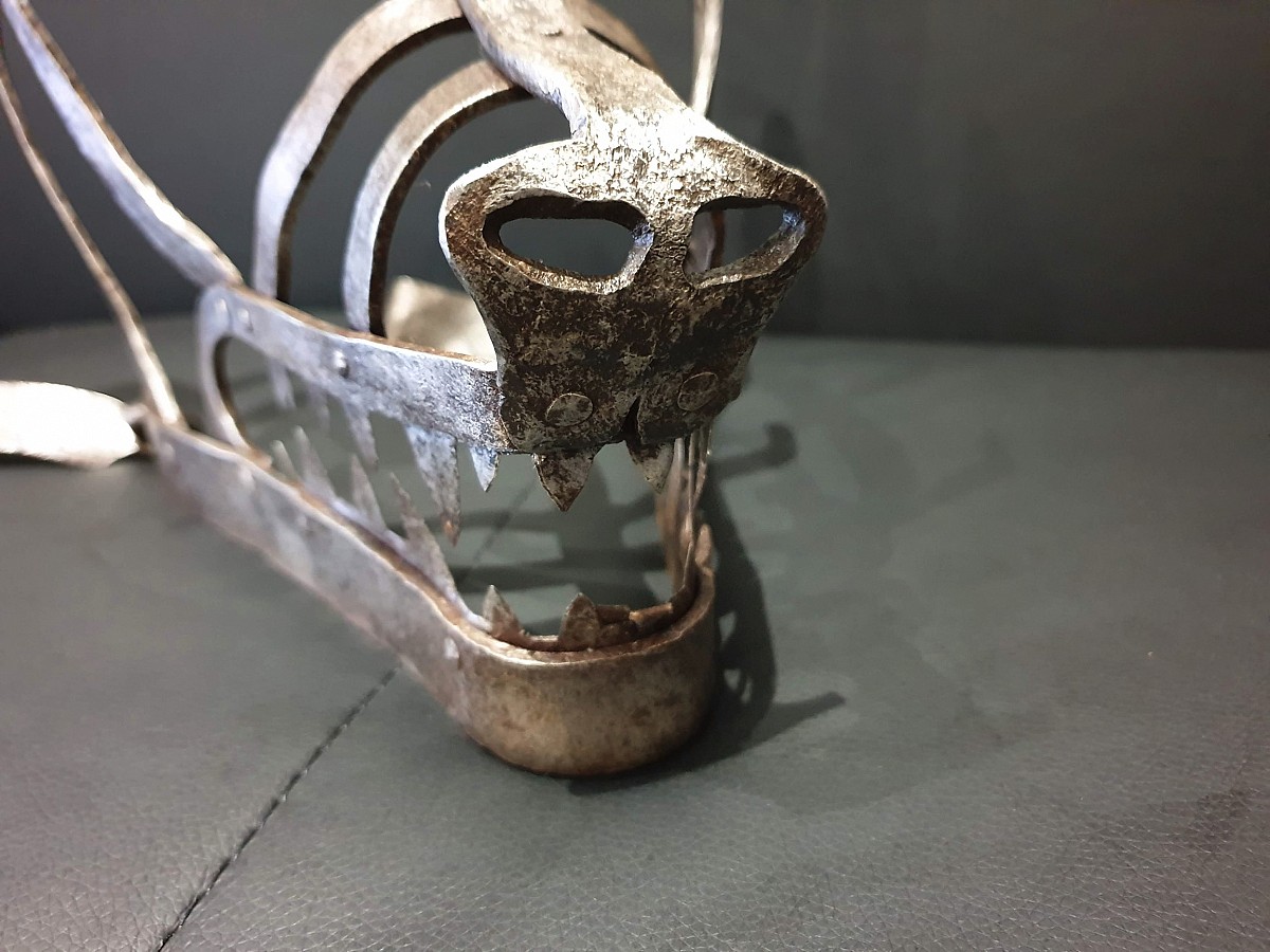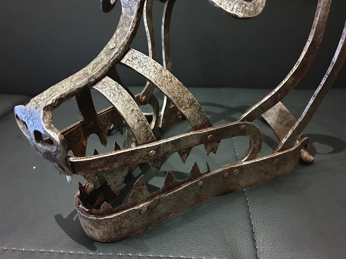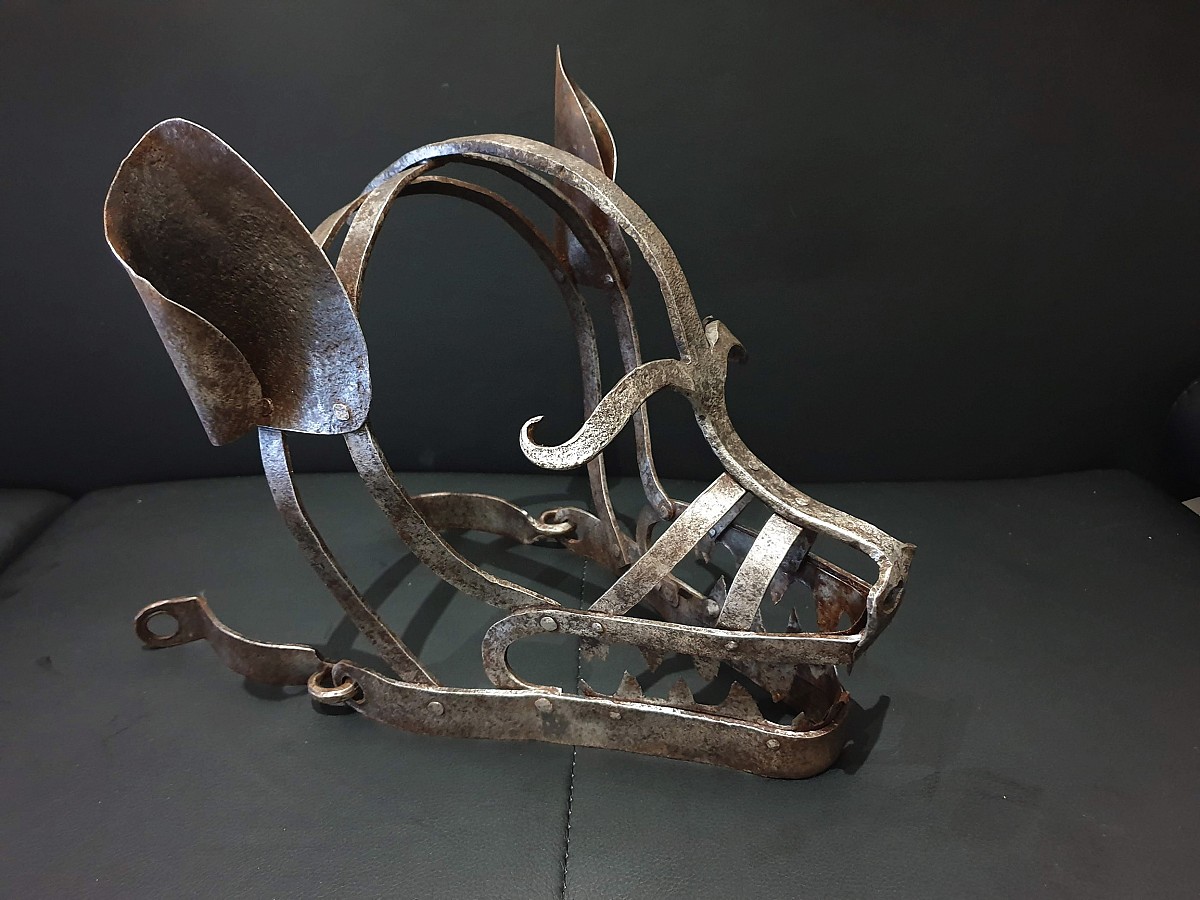 Shameful mask (Schandmaske), Germany, 19th century. Used in Western Europe as a punishment for petty crimes and misconduct Initially, a mask of shame was put on grumpy wives, on women convicted of rudeness in a public place. The mask was a metal structure worn and fixed on the head.
